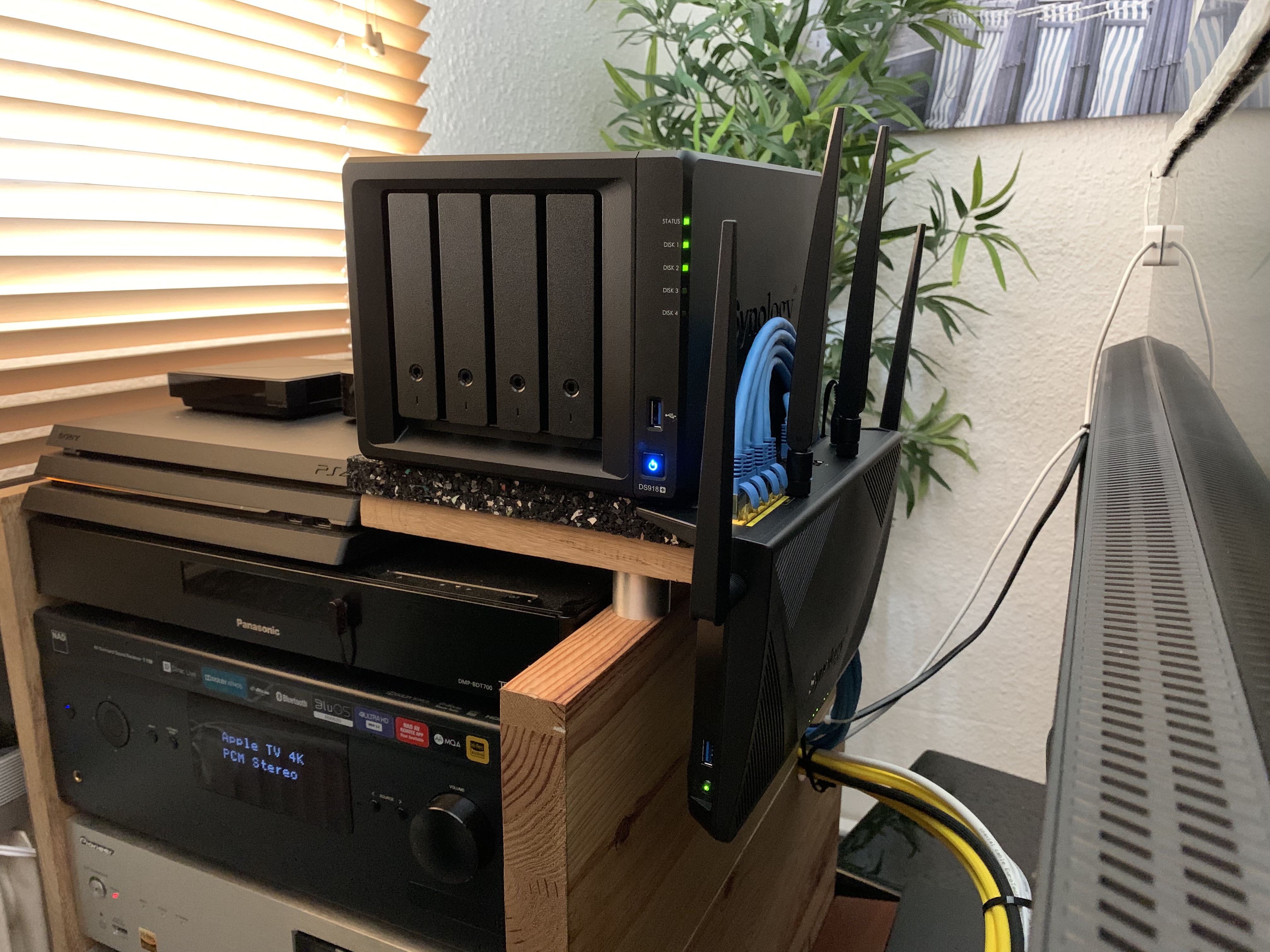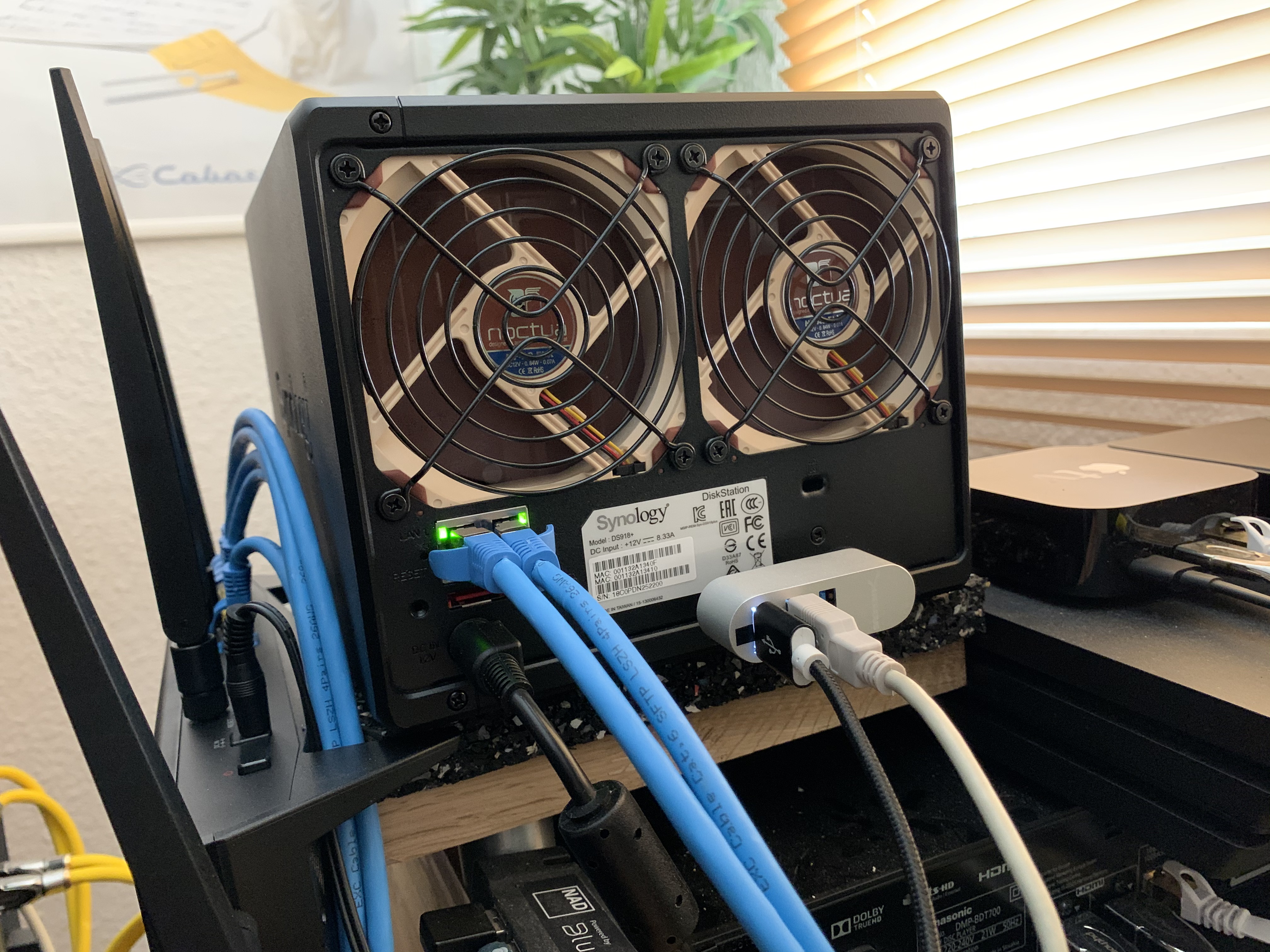 La petite nouveauté de l'été (Après les Eole hivernale) ! Eh oui on ne parle pas assez des systèmes de stockages pour nos contenues dématerialisés (films, musiques) et de la partie réseau (importante pour une bonne transmission des données, je vois que beaucoup ont des problèmes de transmission en Wifi et cie ...) ici j’ai remplacé mon vénérable Synology DS216+II (qui manquait de place) par un Synology DS918+, avec pour le moment 6To WD Red en RAID1 (bientôt 18To en RAID5 histoire que ça envoie encore un peu plus) 128Gb en RAID1 de cache SSD, 16Gb de RAM, 2 ventilateurs Noctua pour abaisser le bruit et avoir un refroidissement plus efficace, deux liens Ethernet en agrégation vers un nouveau routeur Synology RT2600ac, lui même en agrégation sur la Livebox et avec une partie Wifi très stable surtout avec plusieurs appareils, j’arrive a avoir un débit aussi bon voir meilleur qu’en Ethernet ... a l’usage tout se charge plus vite, c’est clairement surdimensionnée a l’heure actuel, je lis les films UltraHD sans aucuns chargements, et les bases de données avec beaucoup de fichiers se chargent instantanément ...