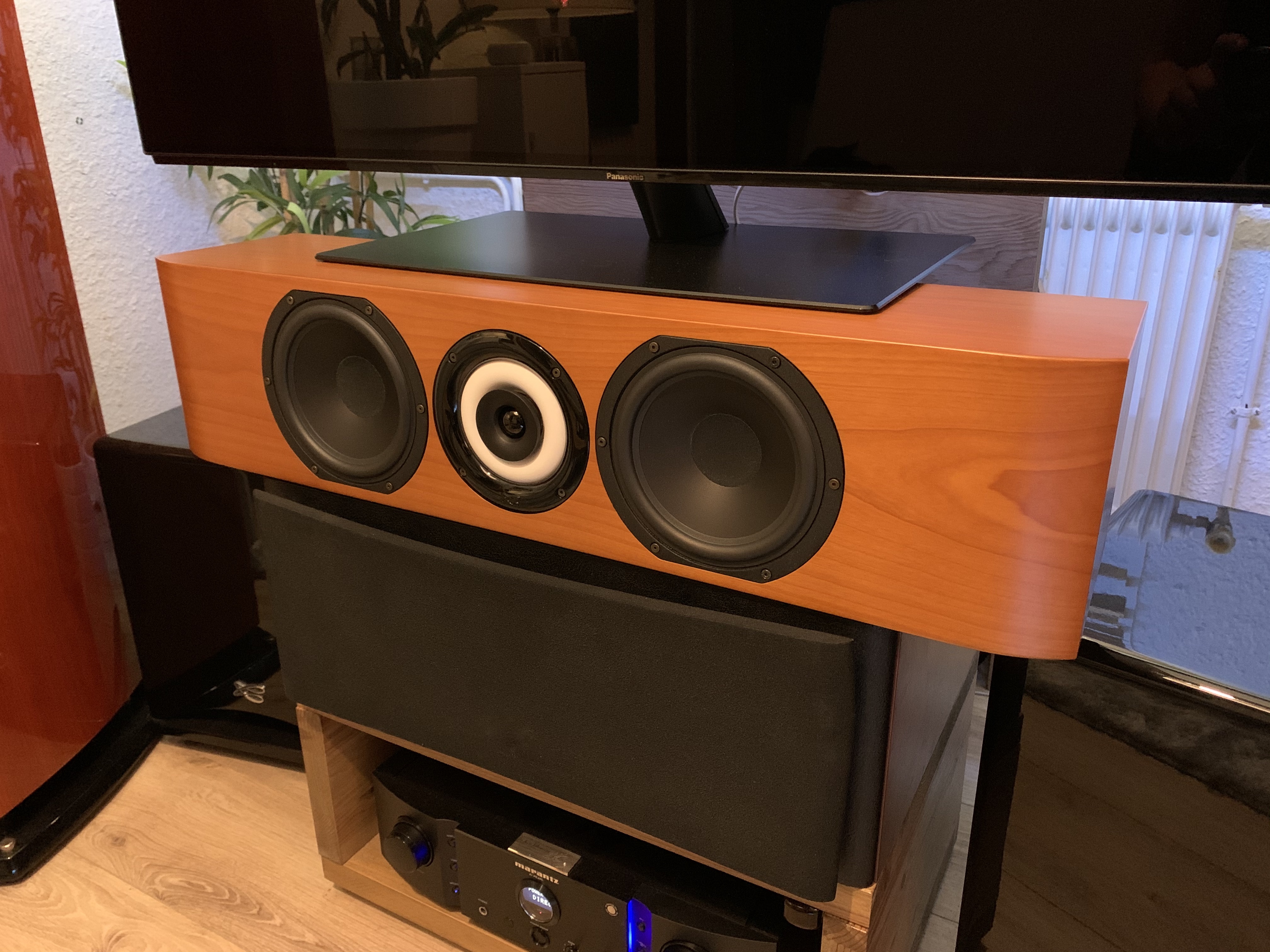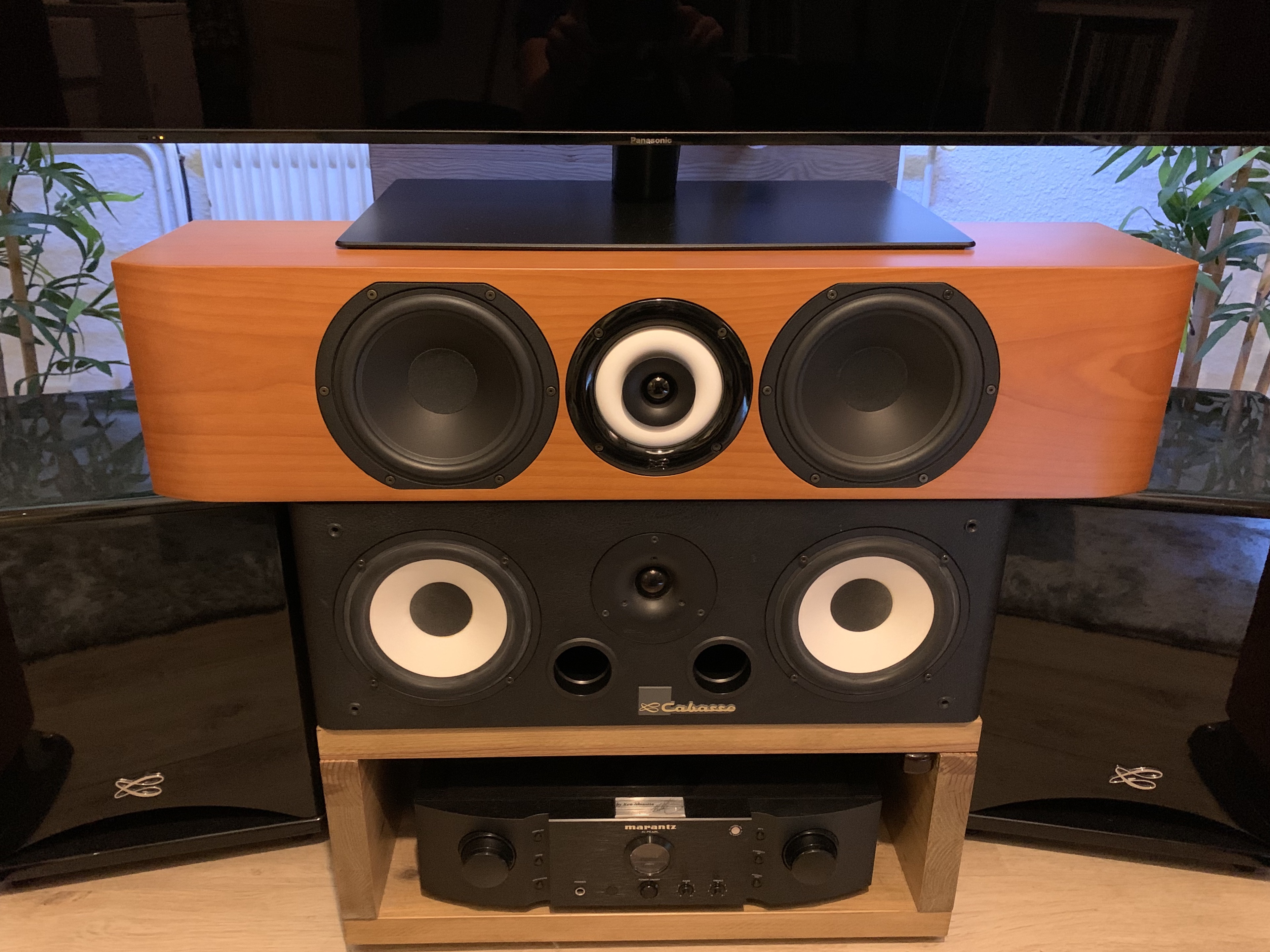 Alors techniquement on pourrait croire que c’est une Egea 3 en version horizontal, mais il en est rien, Ambrose 3 est tout d’abord une enceinte close, son filtrage est tout aussi différent, elle ne descend pas dans le grave et pour le coup c’est très malin de la part de Cabasse, en effet dans le cas d’une enceinte Home Cinéma elle doit être soit déclaré en « LARGE » si elle est capable de descendre à 20Hz ou en « SMALL » quand elle coupe au dessus, Cabasse à fait le choix de limiter l’enceinte à 75Hz, elle colle donc parfaitement aux spécifications de THX qui préconise une coupure de toutes les enceintes à 80Hz dans le cas d’enceintes « SMALL », le reste du spectre étant renvoyé au caisson. Le BC13 lui commence à travailler à 920Hz, combiné aux HP de grave qui eux sont très rapprochés du HP coaxial, ça permet une meilleur mise en phase. La comparaison avec ma Kereon ayant une construction bien plus « classique » (Basse reflex, descend à 55Hz, les HP plus étalés) je n’est plus cette sensation de « voile » dans le bas médium qui m’a toujours gêné avec cette enceinte, je la trouvais aussi plus directive. Avec Ambrose 3 le haut du spectre va plus loin, le médium est bien plus doux, le bas du spectre lui est plus lisible en fait je n’arrive plus à faire la différence avec mes Iroise. Dommage que Cabasse est arrêté cette enceinte, surement trop peu vendue, je pense qu’elle fait partie des meilleurs enceintes centrale jamais sortie par Cabasse dans la gamme traditionnelle.